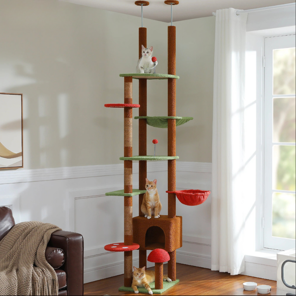 Cet arbre à chat en bois crée une zone verticale adaptée pour l’intérieur, avec une hauteur réglable de 237 à 256 cm. Il propose plusieurs niveaux pour se reposer ou observer, ainsi que des plateformes et hamacs pour varier l’accès.