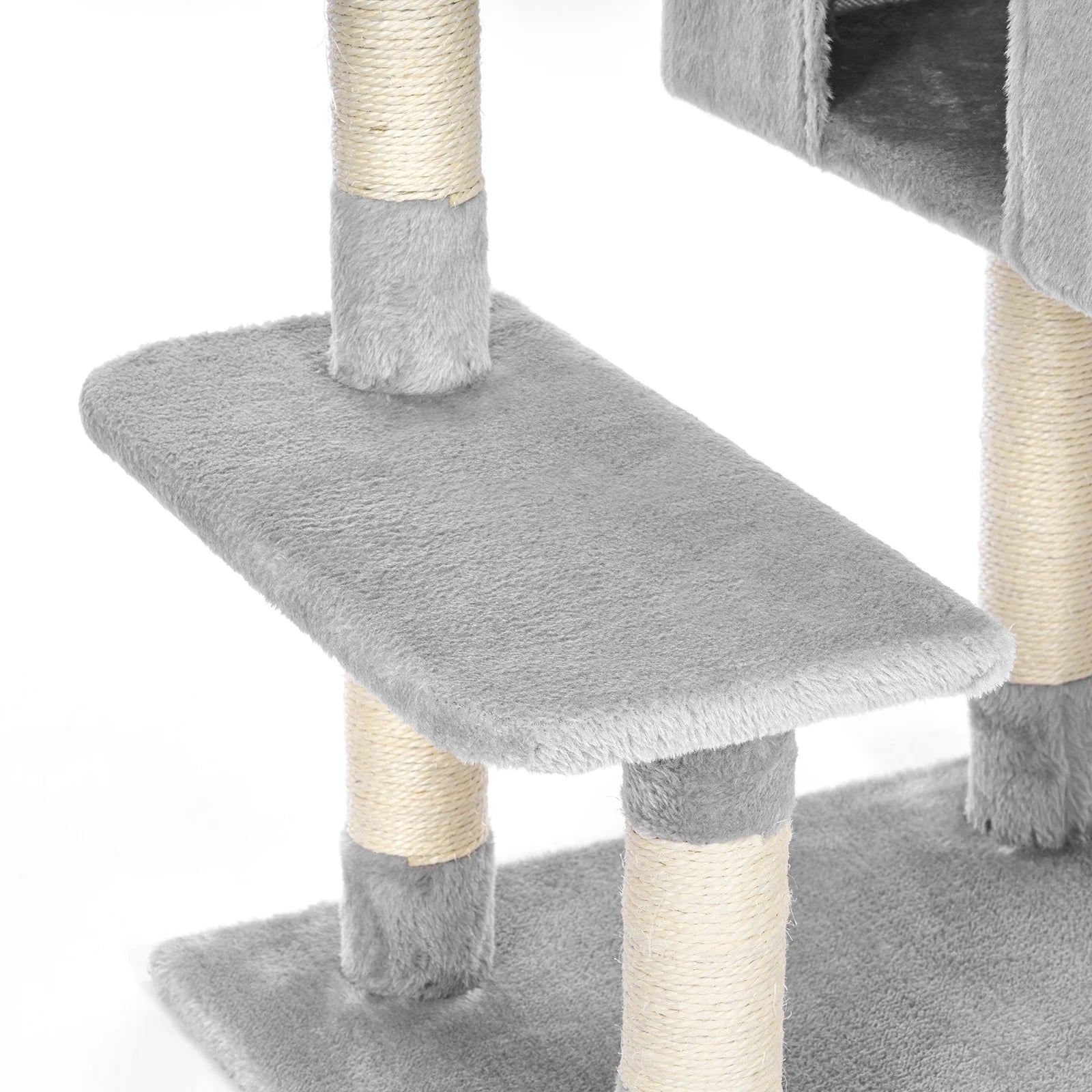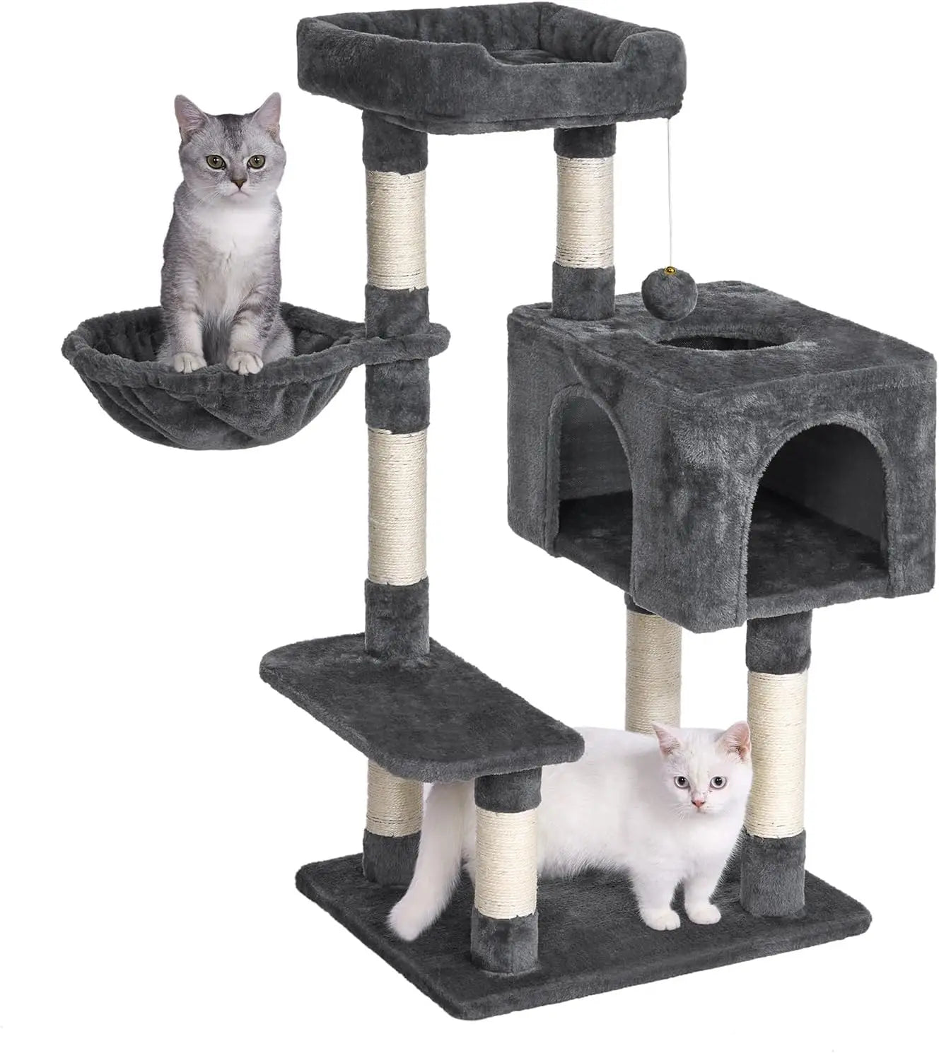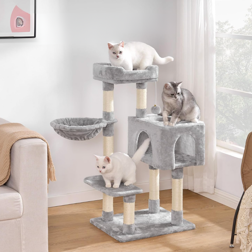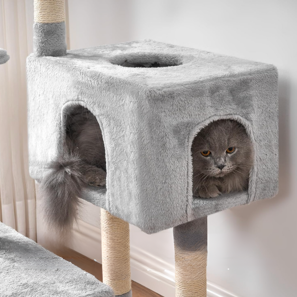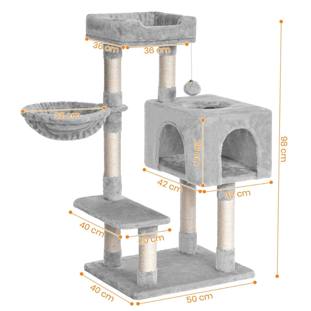 Le hamac et la niche créent des zones calmes, tandis que les poteaux en sisal servent de surface dédiée au grattage.