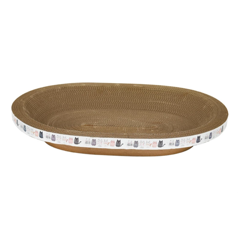 Ce lit à gratter ovale combine une surface en carton alvéolé et une forme simple pensée pour proposer un espace où le chat peut se poser. Sa structure légère peut s’installer dans un coin calme de la maison.