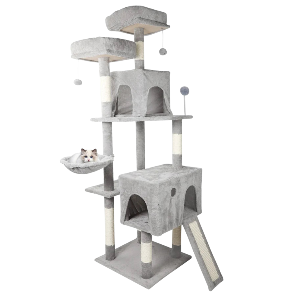 - Éléments intégrés : Plateformes, niche, échelle, poteaux en sisal, pompons