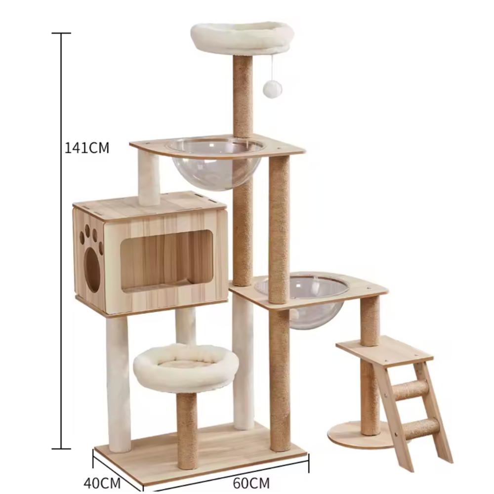 Sa capsule transparente, sa niche et ses niveaux créent différentes zones pour se poser et observer.