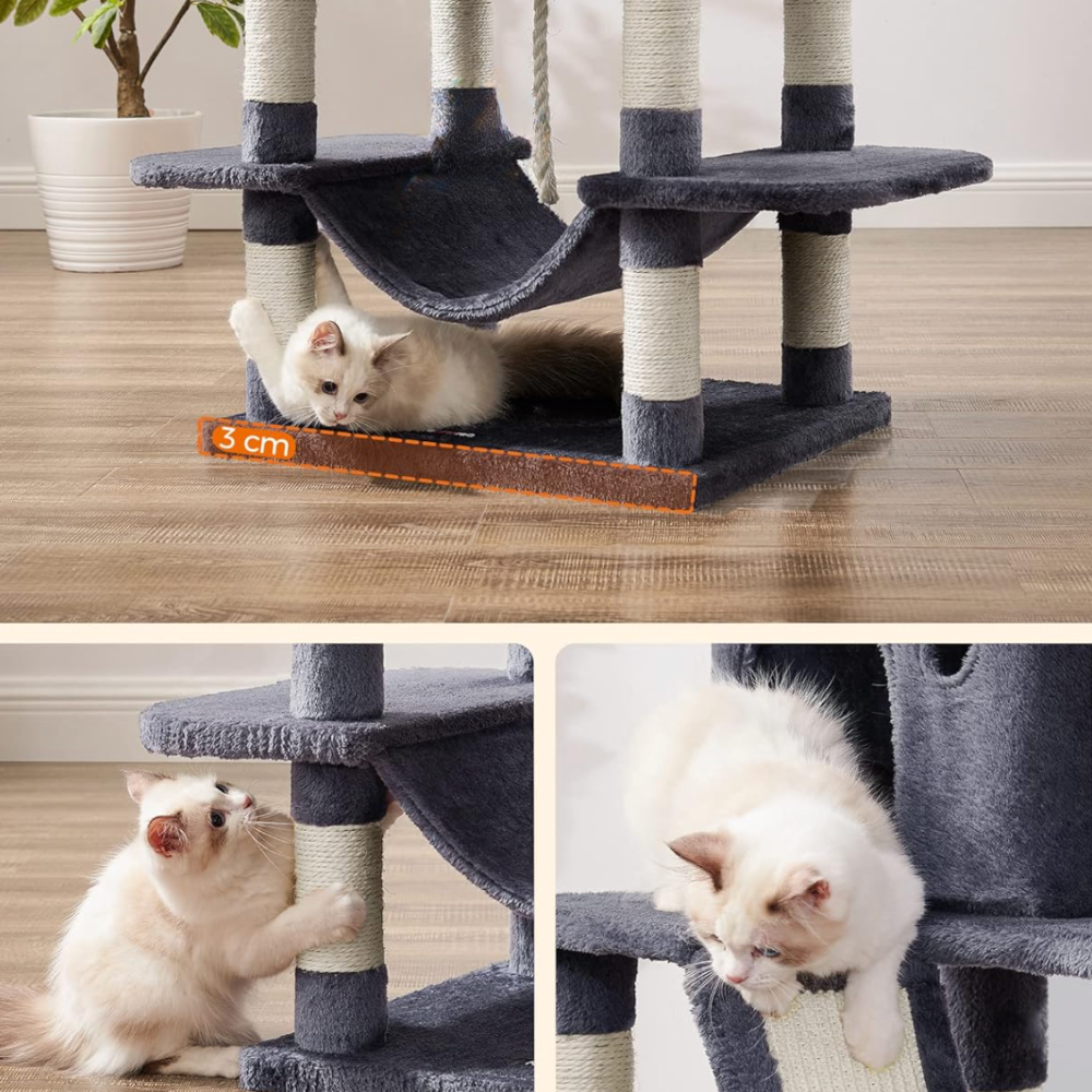 Loft 206 est un arbre à chat composé de plusieurs niveaux, de plateformes, d’une niche, d’un panier et de poteaux en sisal.